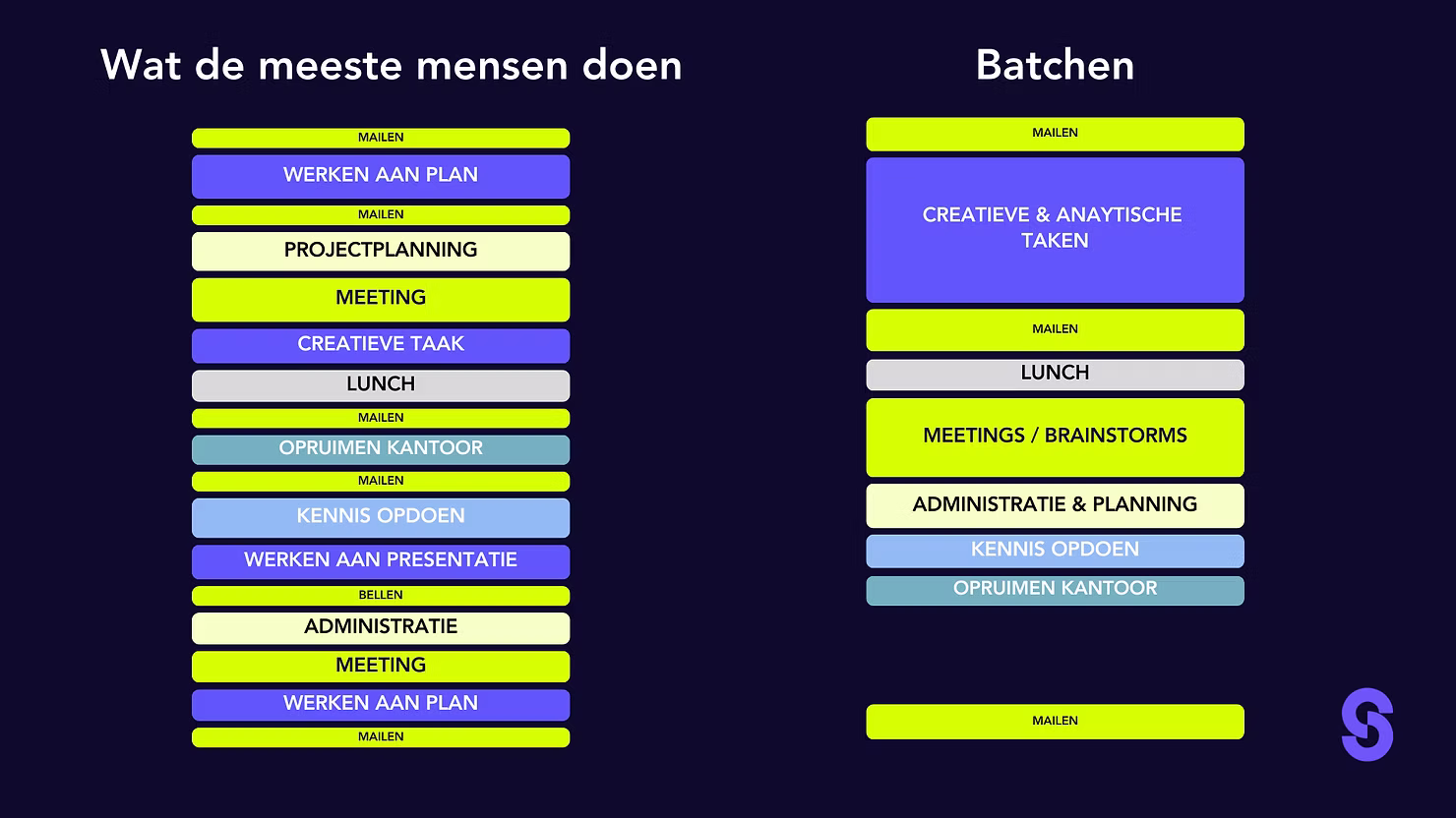 Continu switchen tussen verschillende soorten werk kost ons brein super veel energie. En je brein heeft altijd wat ‘opstarttijd’ nodig wanneer je start aan een complexe(re) taak.